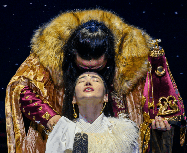 Even before the curtain rises, the intricate details of the stage set catch our eyes. Cultural motifs and creatures frame the stage, and with the vibrant music and dance celebration at the opening scene, we are immediately transported into the heart of Mongolian culture. The stage then seamlessly shifts from festive grounds to a place of secret trysts and battlefields.